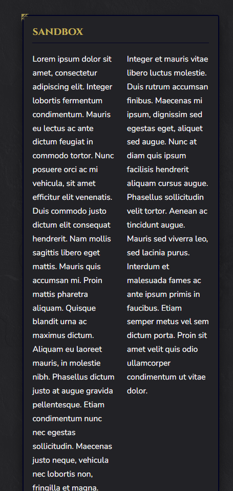 You can edit the spacing between these columns with the "gap" style rule in the initial display, and you can additionally customize them by styling the divs, as well. Want each column to have different colored background? You can do that by adding styling to the column divider, or the initial div for the leftmost column. Additionally, you can insert any text you'd like into the columns, including bullet lists, additional HTML/CSS formatting, etc. It will always be rendered into two columns.