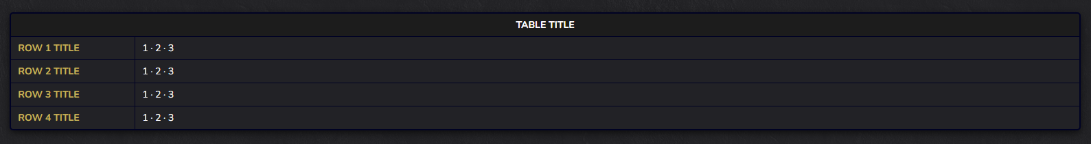 Included in the template is a line for the title, replace the text "TABLE TITLE" to update that. Then there are 4 rows included, but you can use as few or as many as you want, in theory. You can copy an entire block starting with "<!--- SECTION # --->" and ending with "</tr>", before the new line, and paste it above or below the other sections to add another row.